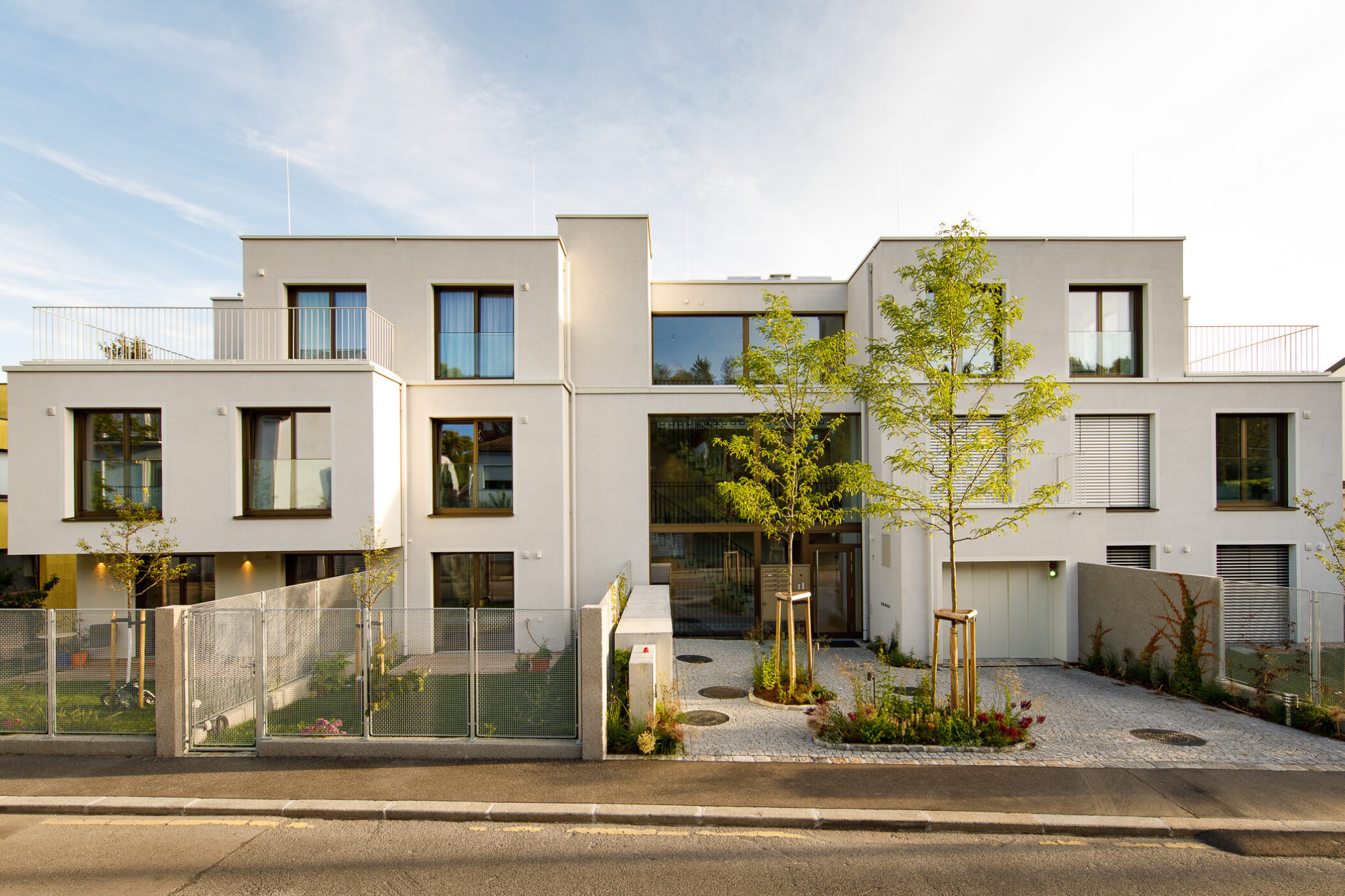 Die Einfahrt zur Tiefgarage befindet sich an der Schnittstelle der Fassaden der bestehenden Häuserreihe, was die visuelle Eigenständigkeit des neuen Gebäudes unterstreicht. Die helle und strukturierte Putzfassade fügt sich gut in den Kontext des Ortes ein. Das Dachgeschoss wird als eigenständiges Volumen betont und mit vorbehandelten Holzplatten verkleidet. Das Raumprogramm umfasst eine Eventagentur im Erdgeschoss und eine Gartenwohnung zum Innenhof. Im Obergeschoss sind zwei Wohnungen und im Dachgeschoss eine Wohnung mit großzügigen Terrassen untergebracht.