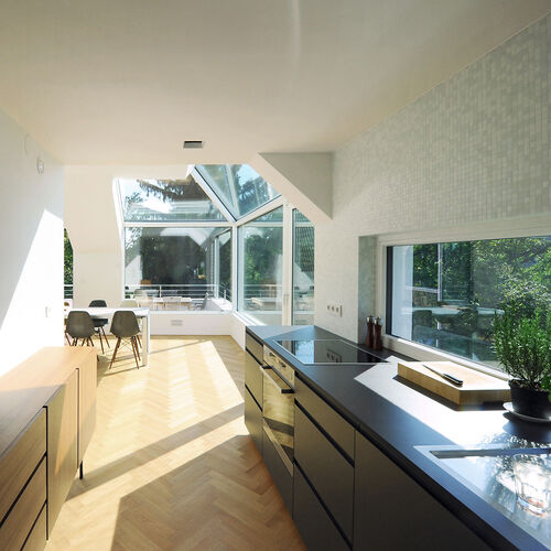 Die Umgebung ist von einer gewachsenen Gebäudestruktur geprägt, die sich über das letzte Jahrhundert aus Einfamilienhäusern und kleinen Stadtvillen entwickelt hat. Der kompakte Wohnbau übernimmt diese Maßstäblichkeit und bietet dennoch Raum für drei Wohneinheiten mit Außenbereich.